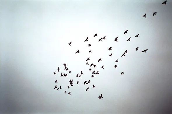 In the sky to the north a flock of small black birds arced and dived in perfect formation. Half veiled by a rain cloud they looked not quite real, their wings in flight like an effect of a strobe light instead of their actual beating: fast, fast, fast.